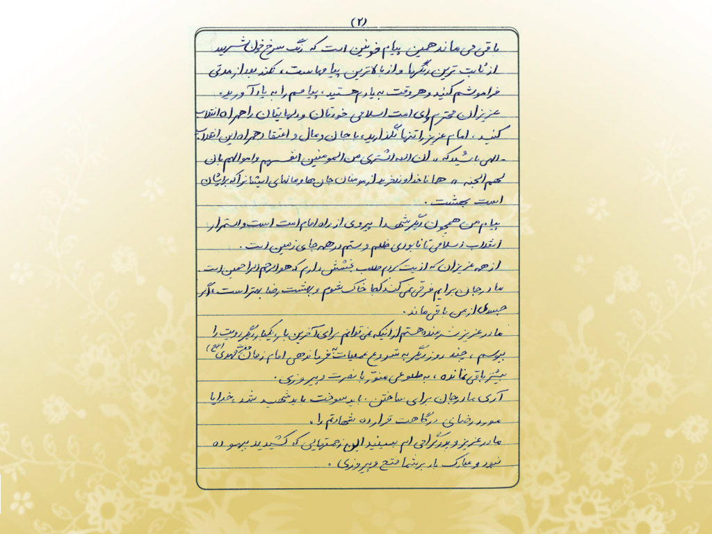 من کمی با او صحبت کردم که از دلش دربیاورم و کمی از ناراحتیش کم کنم ... موهای طلایی رنگ علی بهم ریخته بود ... با انگشتانم موهایش را مرتب کردم ... او را بوسیدم و از او خواستم که دیگر ناراحت نباشد . و به او گفتم : برایم خیلی دعا کن ... باشه؟ علی گفت: باشه!